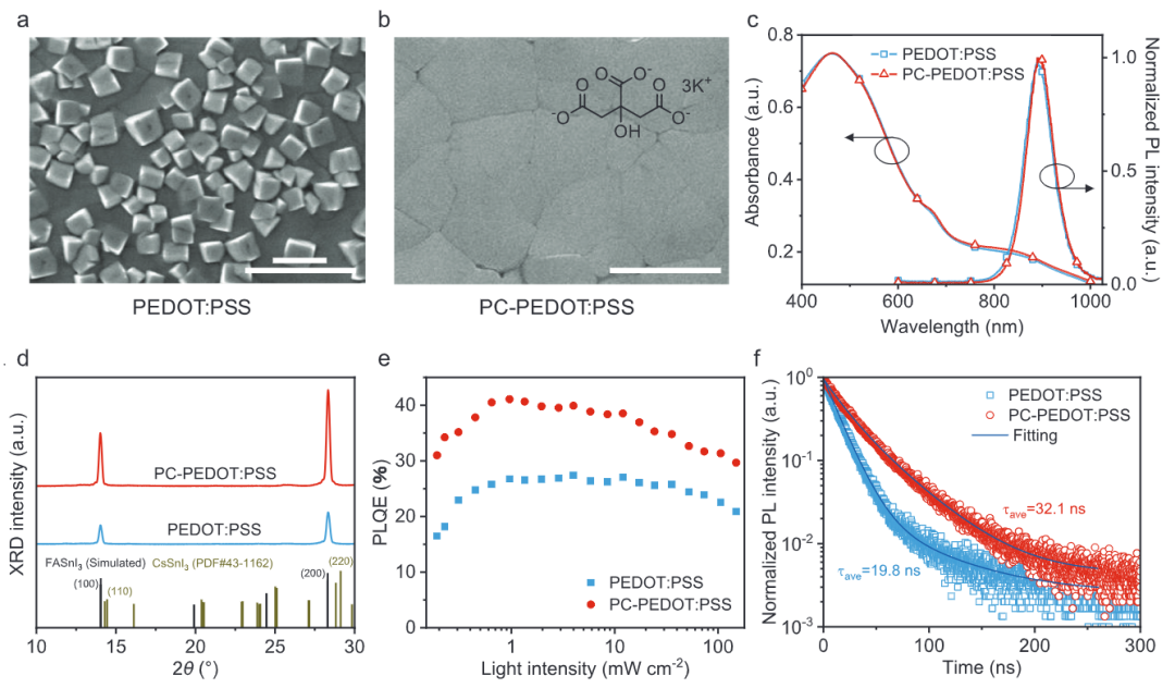 实验表明,原始PEDOT:PSS基底通过强PEDOT?-[SnI?]???相互作用诱导底部界面主导成核,导致锡钙钛矿快速向上结晶,形成粗糙薄膜(光致发光量子效率PLQE≈26%)。通过柠檬酸钾(PC)修饰基底可削弱PEDOT?-[SnI?]???相互作用,将成核起始重定向至顶部界面,实现缓慢向下结晶,获得高结晶度、低缺陷的平滑薄膜(PLQE≈41%)。