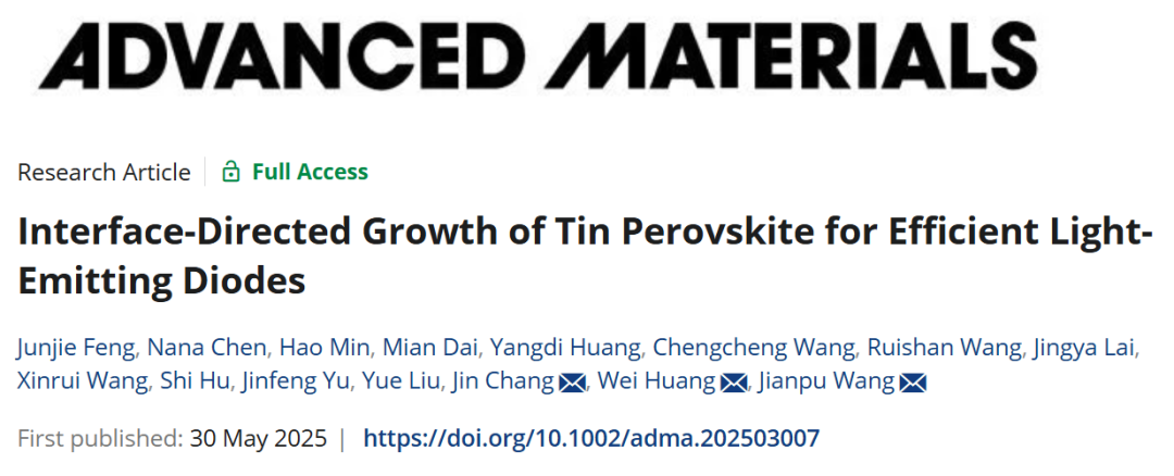 J. Feng, N. Chen, H. Min, M. Dai, Y. Huang, C. Wang, R. Wang, J. Lai, X. Wang, S. Hu, J. Yu, Y. Liu, J. Chang, W. Huang, J. Wang, Interface-Directed Growth of Tin Perovskite for Efficient Light-Emitting Diodes. Adv. Mater. 2025, 2503007.