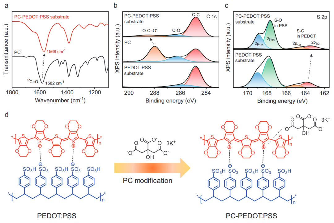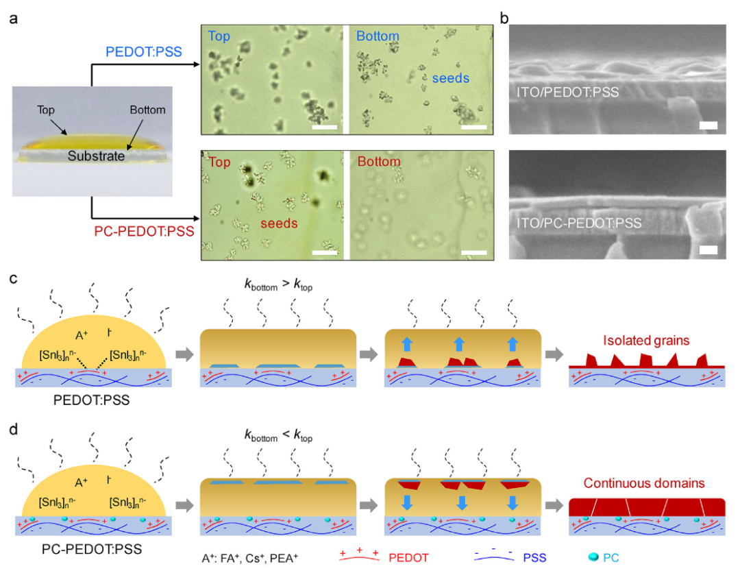 界面成核调控机制:首次揭示PEDOT:PSS基底通过强PEDOT?-[SnI?]???相互作用驱动锡钙钛矿快速向上结晶,而PC修饰通过削弱该作用转向顶部界面成核,实现缓慢向下生长,显著提升薄膜质量。
