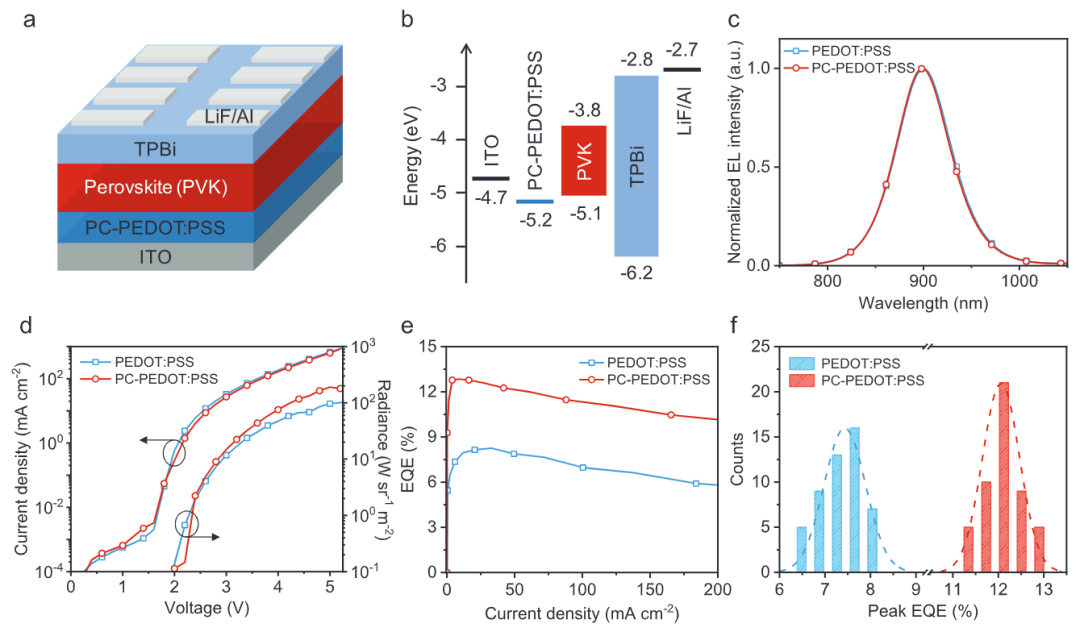 性能突破:基于PC-PEDOT:PSS基底的锡钙钛矿LED创下12.8%的EQE和190 W sr?¹ m?²辐射亮度纪录,为近红外无铅钙钛矿LED树立新标杆。